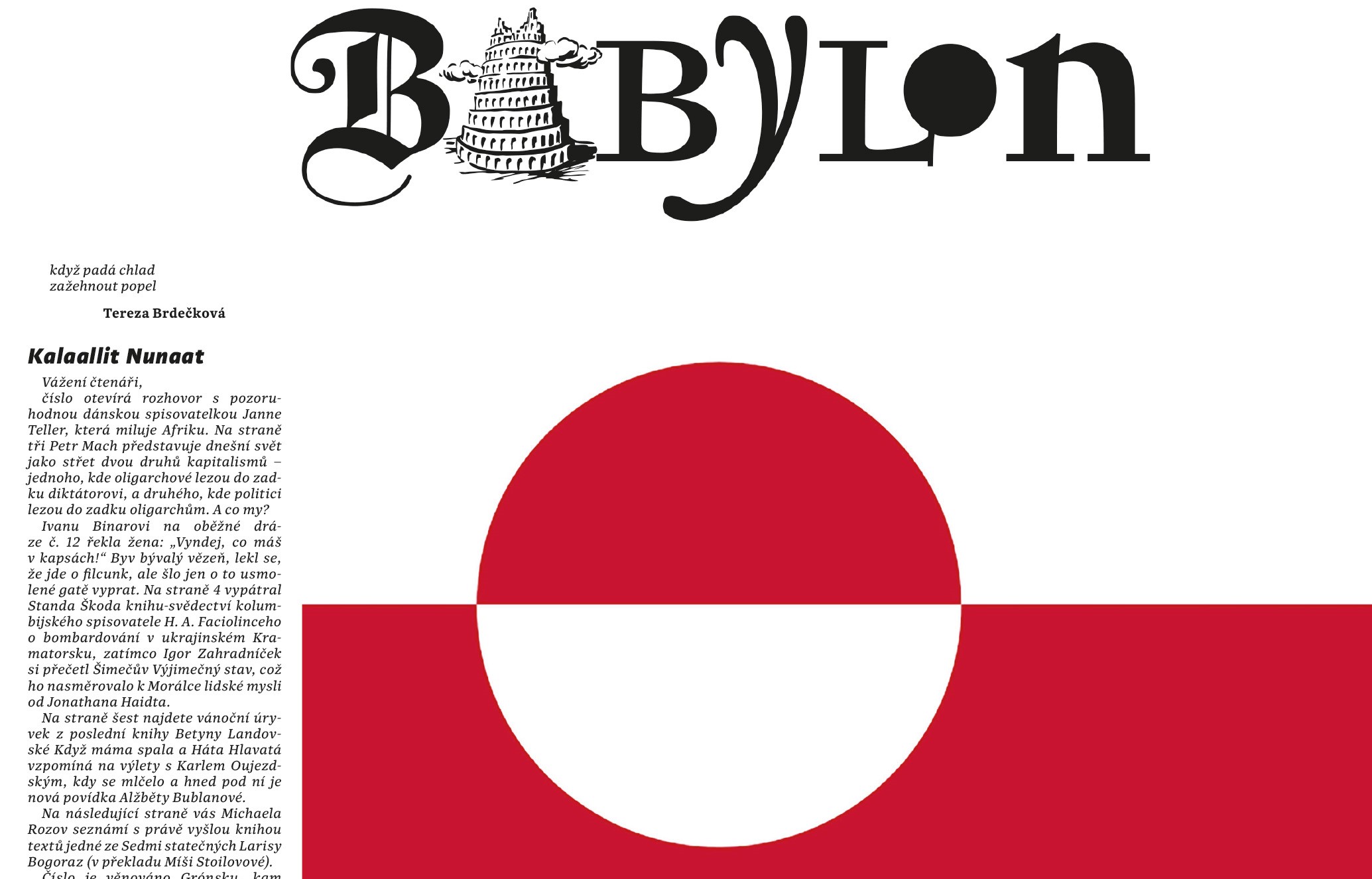 Vánoční číslo je věnováno Grónsku, kam letos v červnu podnikl Babylon expedici. Z původního záměru je ale torzo. Domluvili jsme tam řadu rozhovorů, pošleme otázky mailem, že si to v klidu rozmyslí, včetně inuitské učitelky ve vsi Kapisillitu, inuitské luteránské farářky v Nuuku nebo vládní pracovnice přes kulturu, ale nikdo se pak, přes opakované urgence, už neozval, což by mohlo být i sympatické, kdyby ovšem nešlo o Babylon… Tak je z toho jen to, co se nám podařilo nahrát na místě – rozhovor s pracovníci mezivládní (cirkumpolární) organizace pro práva Inuitů, který je ale jen začátek, protože se v baru, kde jsme jej dělali, strhla bitka a všechny nás vyhodili, pak kratičký rozhovor s kapitánem lodi, který nás převážel přes fjord do Nuuku, a pak ještě kratší rozhovor-báseň s chlapíkem v hospodě, který chlastal jako Dán, ač byl Dán jen po otcovi. Díru jsme tedy zaplnili starým cestopisem z Grónska Světla Quoqortoku, který je skoro dvacet let starý. Myslel jsem, že už kdysi v Babylonu vyšel, ale asi nevyšel, protože v archivu Babylonu není.