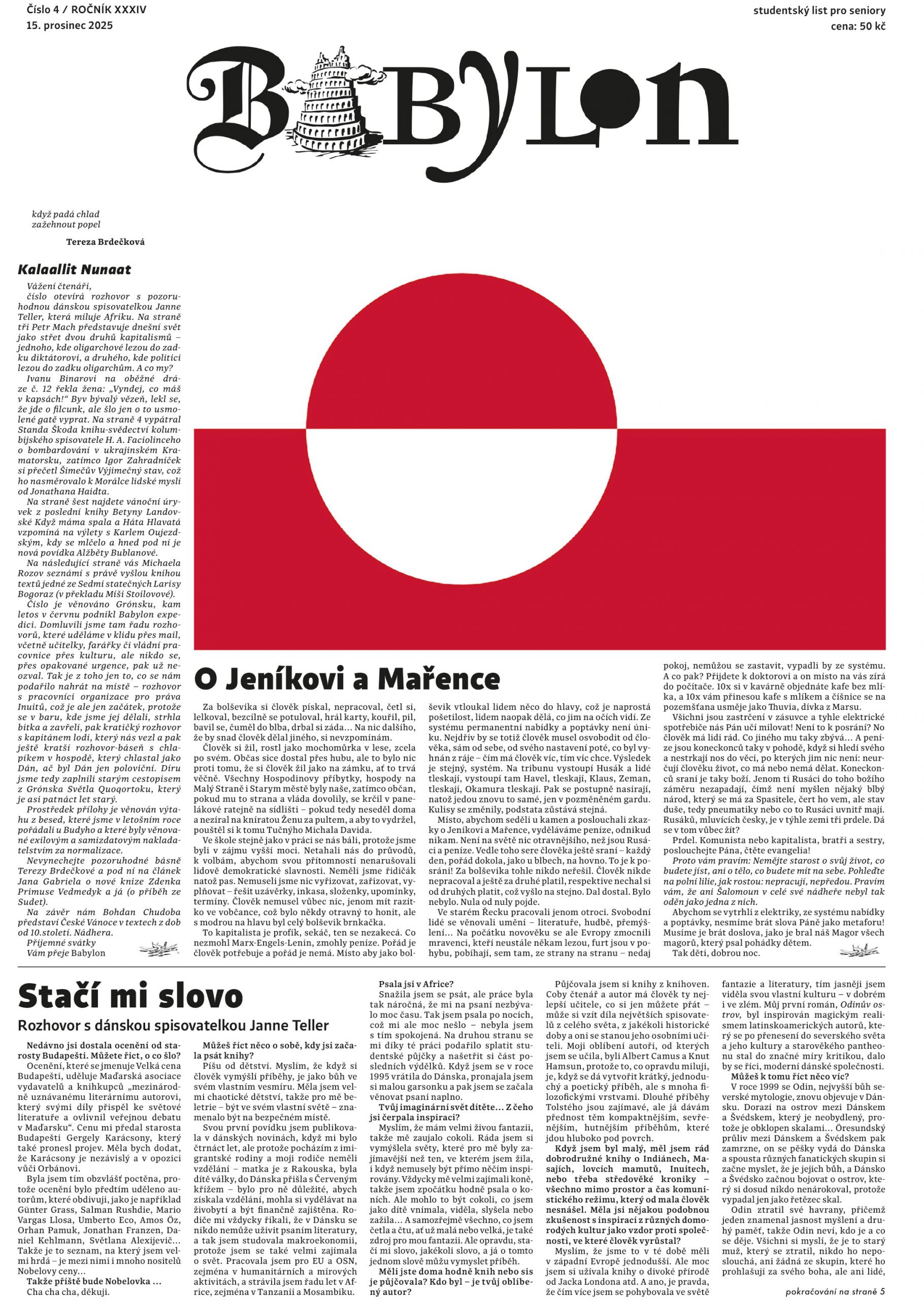 vánoční číslo otevírá rozhovor s pozoruhodnou dánskou spisovatelkou Janne Teller, která řadu let pracovala pro OSN v Africe a od té doby Afriku miluje – právě jí vyšla v nakladatelství Pulchra knížka. „Život je dar, který nám někdo dal. Nevíme kdo, nevíme proč, ale víme, že ho máme,“ říká Janne.